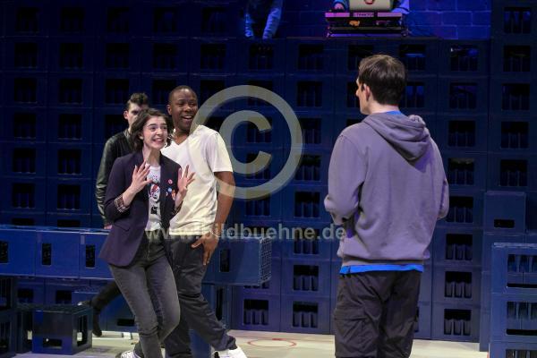 Titel: Das schoenste Maedchen der Welt - fuer Menschen ab 13. Autor: nach dem Film von Aron Lehmann, Bearbeitung von Karsten Dahlem. Regie: Frank Panhans. Buehne Kostueme: Jan A. Schroeder. Choreografie: Nadja Raszewski. Video: Natascha Zander. Dramaturgie: Tobias Diekmann. Ort. GRIPS Theater Berlin. Urauffuehrung: 14. April 2022. no model release. SpielerInnen: Marius Lamprecht / Cem, Helena Charlotte Sigal / Roxy, Matondo Castlo / Rick und Marcel Herrnsdorf / Cyril u.a..