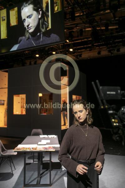 Titel: Moelln 92/22. Autor und Regie: Nuran David Calis. Buehne: Anne Ehrlich. Kostueme: Patricia Ruszkiewicz. Video: Karnik Gregorian. Licht: Jan Steinfatt. Dramaturgie: Stawrula Panagiotaki. Ort: Schauspiel Koeln Depot 2. Urauffuehrung: 8. April 2022. No model release. SpielerInnen: Kristin Steffen und Ismail Deniz u.a..