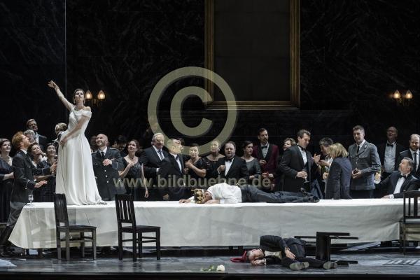 Ort: Deutsche Oper Berlin. Titel: Der Schatzgraeber. Autor: Franz Schreker. Regie: Christof Loy. Buehne: Johannes Leiacker. Kostueme: Barbara Drosihn. Premiere: 01.05.2022 Darst.: Doke Pauwels (Die Koenigin, li.), Tuomas Pursio (Der Koenig, M.), Michael Laurenz (Der Narr, u.). Copyright: Marcus Lieberenz/bildbuehne.de (Veroeffentlichung nur gegen Honorar und Belegexemplar!)
