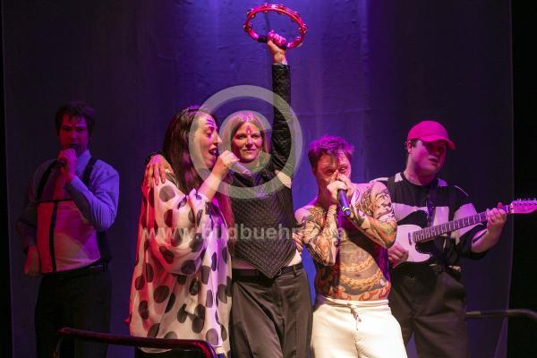 Titel: LEAP … Into the Unknown. Regie: Camilla Milena Feher. Buehne: Isolde Wittke. Kostueme: Pablo Alarcon. Licht: Teo Vlad. Video: Jemma Woolmore. Dramaturg. Beratung: Danielle A. Fueglistaller. Ort: Theater Thikwa. Urauffuehrung: 25. Mai 2022. no model release. SpielerInnen: Tim Petersen, Deniz Dogan, Camilla Milena Feher, Felix Bruenig und Stephan Sauerbier u.a..