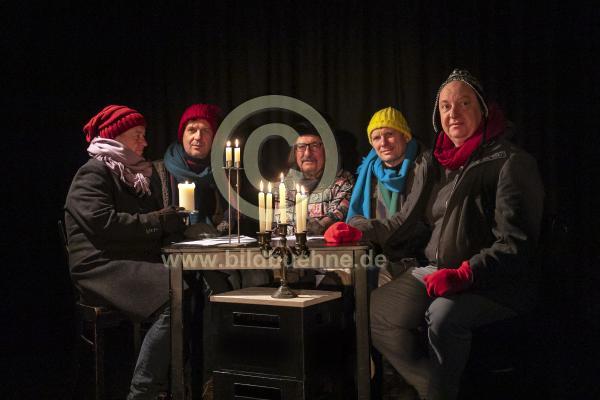 Titel: Kabarettistischer Jahresrueckblick. Premiere im Mehringhoftheater: 14. Dezenber 2022. Thema des Vorabfotos: Strom und Heizung sind unbezahlbar, die Spieler treten dick eingemummelt auf. Spieler: Christoph Jungmann, Bov Bjerg, Manfred Maurenbrecher, Hannes Heesch und Horst Evers. Vorabfoto.