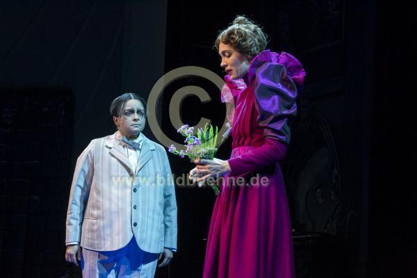 Titel: Der Untertan. Autor: Heinrich Mann. Regie: Christian Weise. Buehne: Julia Oschatz. Kostueme: Josa Marx, Lane Schaefer. Licht: Ernst Schiessl. Dramaturgie: Valerie Goehring. Ort: Maxim Gorki Theater. Premiere: 15. Dezember 2023. no model release. SpielerInnen: Via Jikeli / Diederich Hessling als Untertan und Marta Kizyma / Agnes Goeppel u.a..