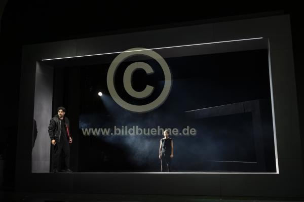 Ort: Maxim Gorki Theater Studio, Berlin. Titel: Hund, Wolf, Schakal. Autor: Bahzad Karim Khani. Regie: Nurkan Erpulat. Buehne: Magda Willi. Kostueme: Dennis Ennen. Premiere: 10.02.2024 Darst.: Edgar Eckert, Doga Guerer. Copyright: Marcus Lieberenz/bildbuehne.de (Veroeffentlichung nur gegen Honorar und Belegexemplar!)