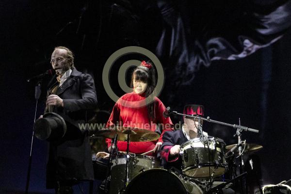 Titel: Der Schimmelreiter / Hauke Haiens Tod. Autoren: nach der Novelle von Theodor Storm und dem Roman: Andrea Paluch und Robert Habeck. Regie: Jan-Christoph Gockel. Buehne: Julia Kurzweg. Kostueme: Sophie du Vinages. Video / Live Kamera: Eike Zuleeg. Licht: Robert Grauel, Puppenbau: Michael Pietsch. Dramaturgie: Johann Otten, Bernd Isele. Ort: Deutsches Theater Berlin. No model release. SpielerInnen: Manuel Harder / Hauke Haien und Hieu Pham, Moritz Hoehne / beide Schlagzeug u.a..