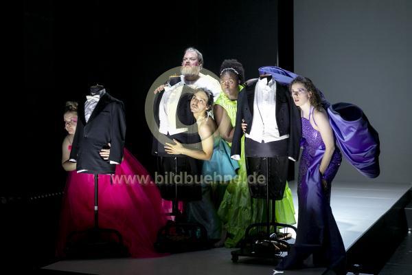 Titel: Pigmalion. Autor: George Bernard Show, Fassung von der Produktion. Regie: Bastian Kraft. Buehne: Peter Baur. Kostueme: Inga Timm. Video: Jonas Link. Licht: Thomas Langguth. Dramaturgie: Christopher-Fares Koehler. Ort: Deutsches Theater Berlin Kammer. Premiere: 27. April 2024. No model release. SpielerInnen: Julia Graefner / Higgins und Mercy Dorcas Otieno, Daria von Loewenich, Jens Koch und Caner Sunar u.a..