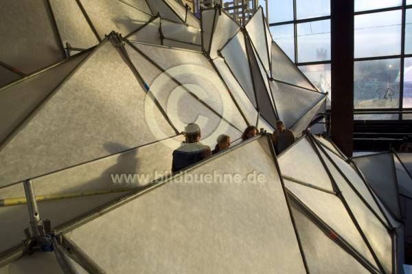 Deutschland, Berlin, Mitte. Ort: Palast der Republik, entkernt und asbestgereinigt. Der Abriss hat zum Jahresbeginn 2006 begonnen. Festival: Volkspalast Zwei - Der Berg -, vierter bis 26 August 2005. Hier: Besucher auf einer der drei Bergtouren im grossen Foyer. Gesamtleitung: Amelie Deuflhard. Kuenstlerische Bergleitung : Benjamin Foerster-Baldenius. No model + property release. Copyright: © david baltzer/bildbuehne.de .