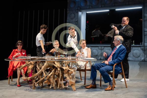Ort: Deutsches Theater, Berlin. Titel: Das Dinner. Autor: Herman Koch. Regie: Andras Doemoetoer. Buehne: Ann-Christine Mueller. Kostueme: Almut Eppinger. Premiere: 26.10.24 Darst.: Wiebke Mollenhauer (Babette Lohmann), Karlo Krammling (Michel Lohmann, Kellner), Ulrich Matthes (Paul Lohmann), Andri Schenardi (Kellner), Maren Eggert (Claire Lohmann), Bernd Moss (Serge Lohmann), Jens Koch (Kellner). Copyright: Marcus Lieberenz/bildbuehne.de (Veroeffentlichung nur gegen Honorar und Belegexemplar!)