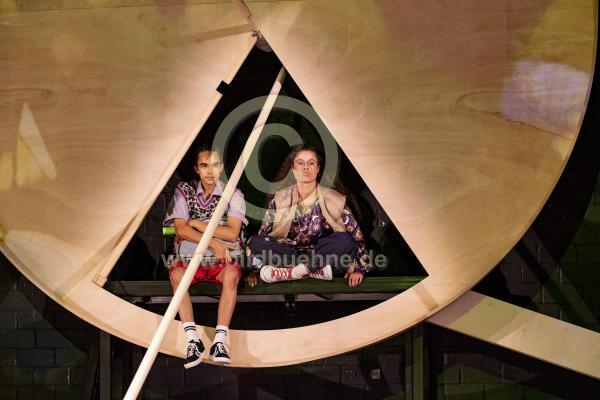 Titel: Woche - Woche. Fuer 1 - 4 Klasse. Autorin: Lara Schuetzsack / Kindertheaterpreis 2023. Regie: Ellen Uhrhan. Ausst.: Sanghwa Park. Video: Omar Gabriel. Dramaturgie: Henriette Festerling. Ort: Grips Theater. Urauffuehrung: 7. November 2024. No model release. SpielerInnen: Kim Biebow / Yella und Eike N.A. Onyambu / Nunu u.a.. Ueber den Stress eines Jungen, dessen Eltern getrennt leben und er wochenweise hin- und herwechselt. Eine entstehende Freundschaft zu einem Maedchen hilft ihm.