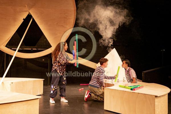 Titel: Woche - Woche. Fuer 1 - 4 Klasse. Autorin: Lara Schuetzsack / Kindertheaterpreis 2023. Regie: Ellen Uhrhan. Ausst.: Sanghwa Park. Video: Omar Gabriel. Dramaturgie: Henriette Festerling. Ort: Grips Theater. Urauffuehrung: 7. November 2024. No model release. SpielerInnen: Kim Biebow / Yella, Marius Lamprecht / Max und Eike N.A. Onyambu / Nunu u.a.. Ueber den Stress eines Jungen, dessen Eltern getrennt leben und er wochenweise hin- und herwechselt. Eine entstehende Freundschaft zu einem Maedchen hilft ihm.