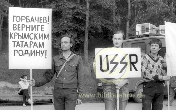 Vilnius, Hauptstadt von Litauen (damals Litauische Sozialistische Sowjetrepublik), Fruehjahr 1989, Demonstration fuer die Unabhaengigkeit Litauens von der Sowjetunion, linkes Transparent "Gorbatschow geben sie den Krim-Tataren die Heimat zurueck"