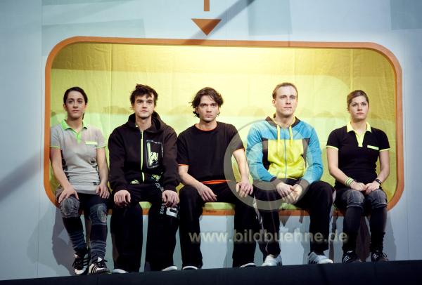 " STRESS ! - Der Rest ist Leben " im Grips Theater Berlin. Urauffuehrung am 11. Februar 2010. Darst.: Nina Reithmeier, Jens Mondalski , Robert Neumann, Sebastian Achilles und Jennifer Breitrueck u.a.. Regie: Frank Panhans. Ausst.: Birgit Schoene. Choreografie: Marcus Grolle. Autor: Dirk Laucke. No model release.